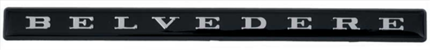 Reproduction fender emblem insert for 1966-1967 Belvedere II models. This plastic insert is often missing from the chrome emblem. Reproduced with chrome lettering on a black background, as original.